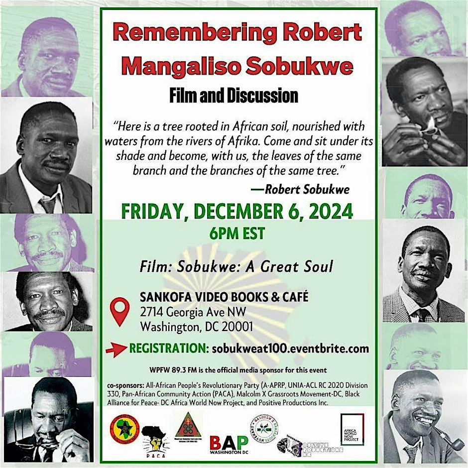 December 5, 2024 will mark the 100th birthday of Mangaliso Robert Sobukwe. Sobukwe was an Azanian (South African) revolutionary Pan-Africanist and founding member of the Pan Africanist Congress of Azania (PAC), who served as the first president of the organization. This FREE Washington DC event on Friday, December 6th will coincide with the commemoration of Sobukwe’s legacy to be held in Azania the following day. The event will be a screening and discussion of a renewed version of the film Sobukwe: A Great Soulby Mickey Madoda Dube about uTatu Sobukwe, followed by a panel of speakers that will include via zoom Mickey Madoda Dube joining us all the way from South Africa.